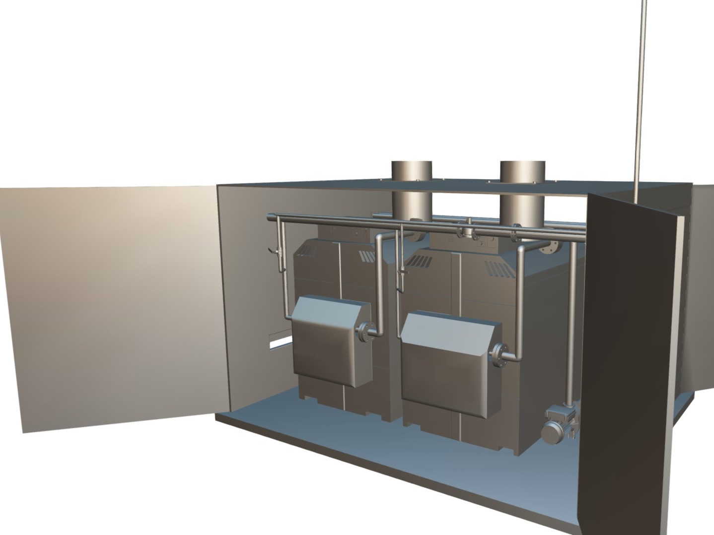- Не требуют строительства отдельного здания, котлы размещаются снаружи отапливаемого здания. Котел управляется с пульта, который устанавливается внутри здания, а также непосредственно внутри котла.