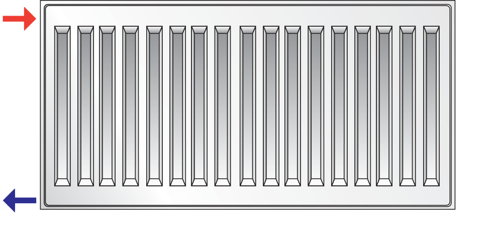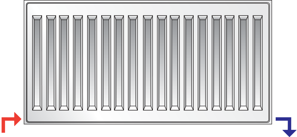 Рекомендуется для радиаторов длиной более 2 000 мм, а также для тех, длина которых вчетверо превышает высоту. Питательая труба должна быть подсоединена к правому или левому верхнему штуцеру, а обратная – к противолежащему нижнему штуцеру. Подсоединение, выполненное наоборот, приведёт к снижению теплоотдачи радиатора более чем на 30%.