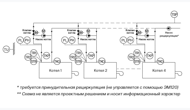 Система автоматики газового котла ЭНТРОМАТИК 120MS имеет единый вид и представляет множество вариаций схем котлоагрегатов, в соответствии с мощностью и заказными характеристиками.